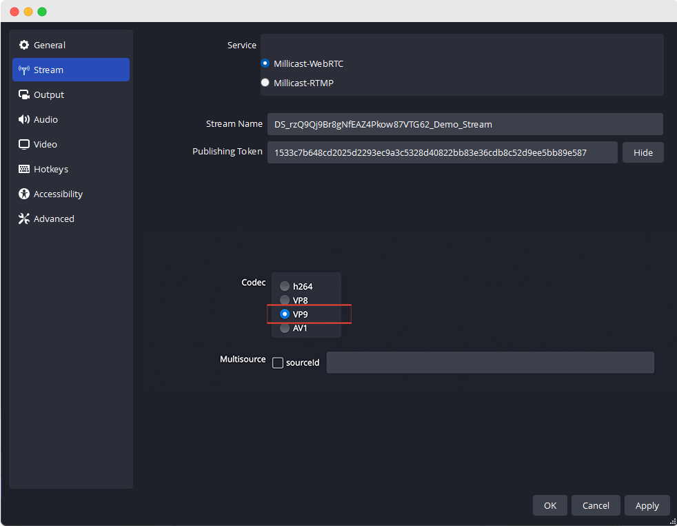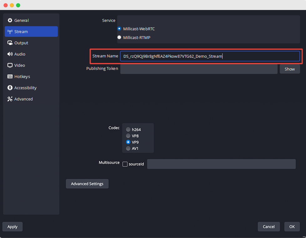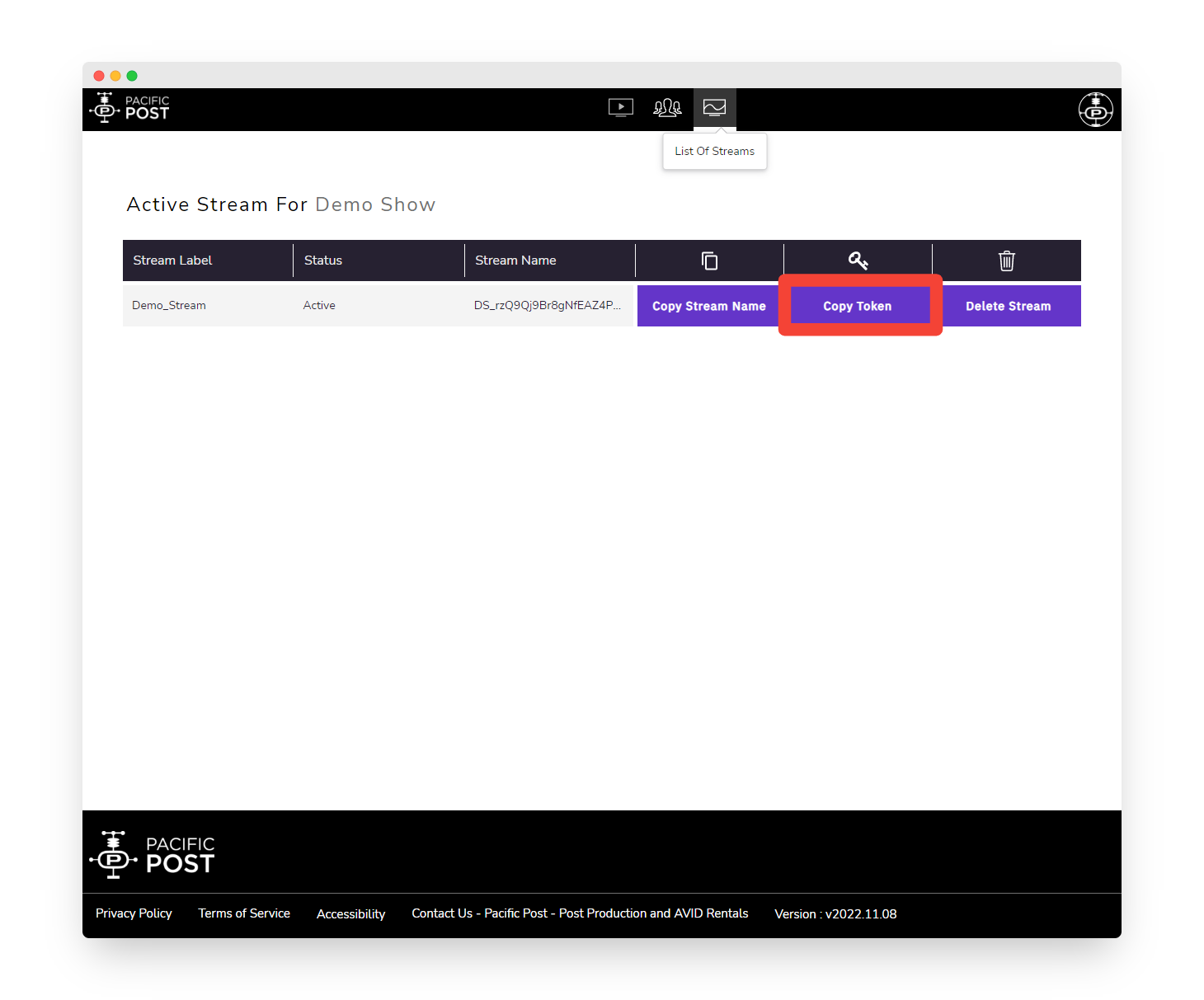 ShowPublisher List of Streams highlighting Copy Token