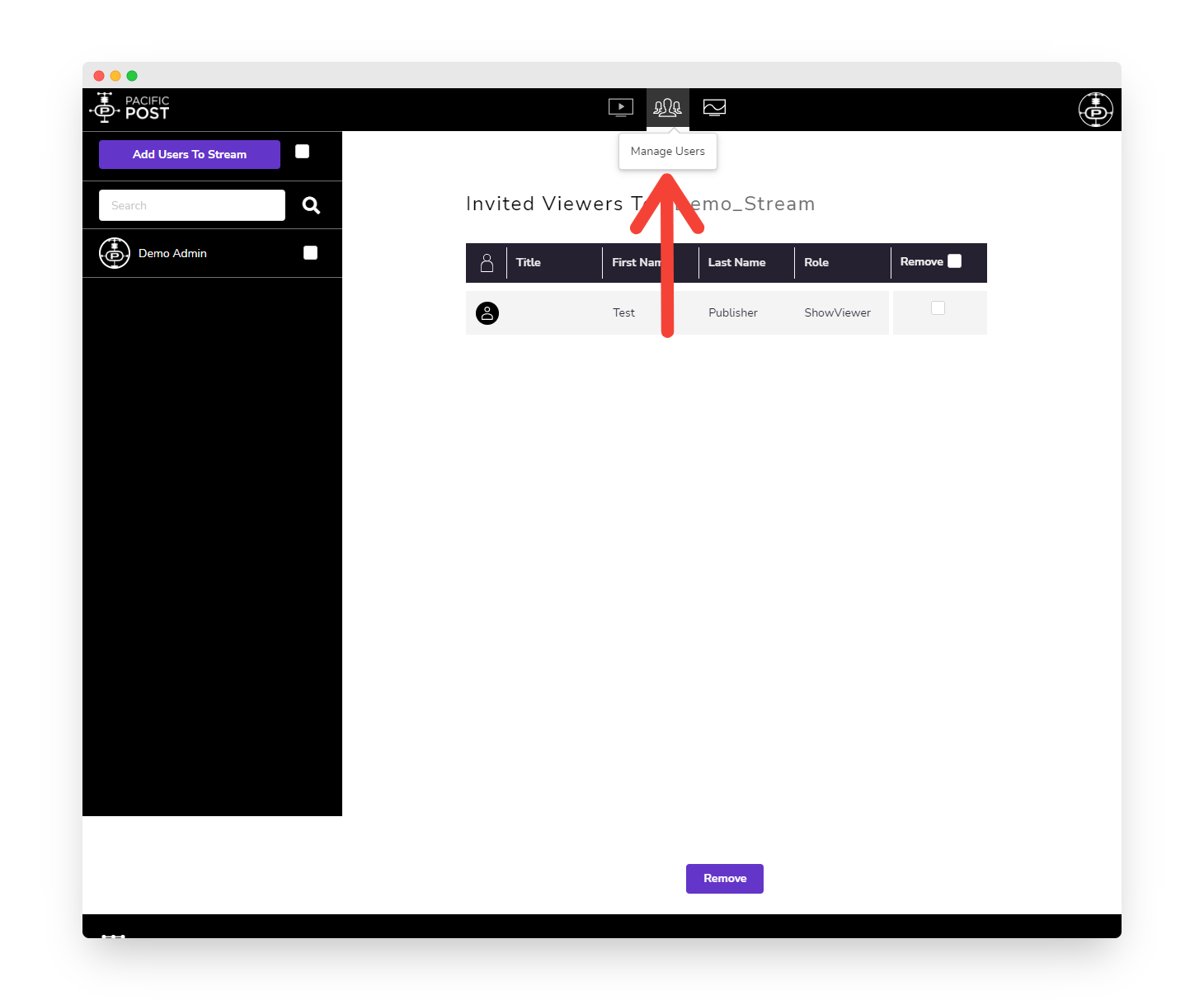 You are now in the Show Publisher portal. To ensure that you are on the Manage Users page, ensure that the Manage Users icon on the top bar is selected and your screen appears as below. On the left side bar you will notice the list of Show Viewers who are not currently invited to the stream. On the right side of the page you will see which Show Viewers currently do have access to the stream.
